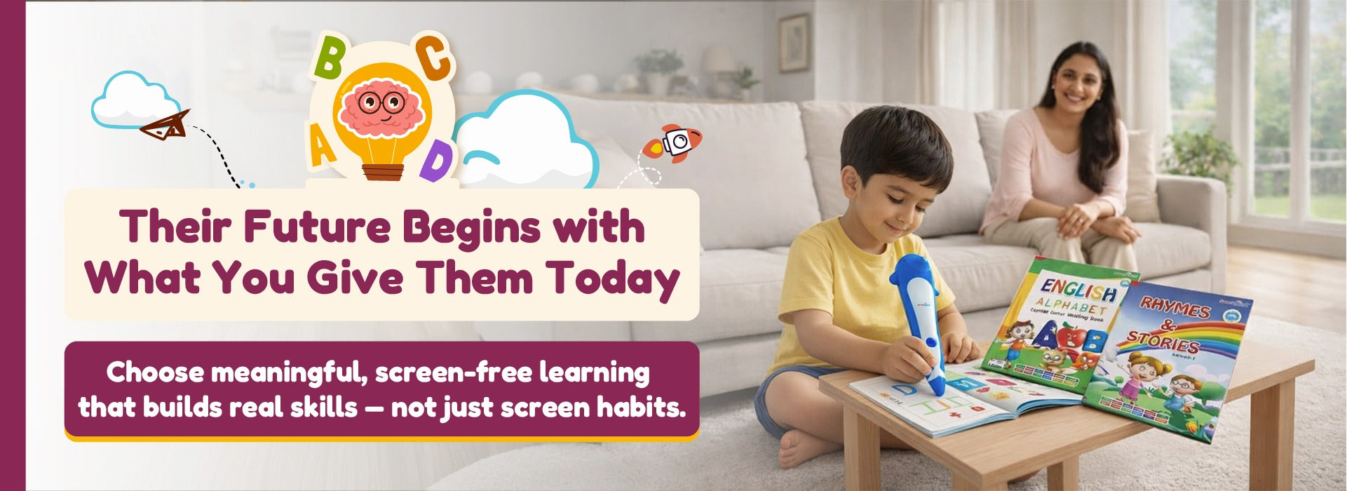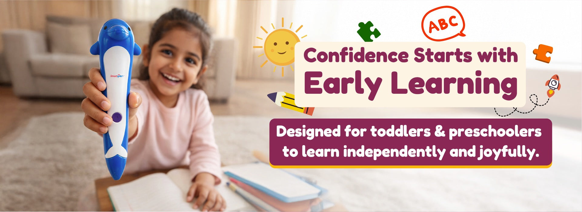 SmartSpeak™ is an interactive Talking Pen technology that works with specially designed books. When your child taps the pen on the book pages, it plays audio such as words, sounds, songs, and instructions — making learning fun, engaging, and screen-free.